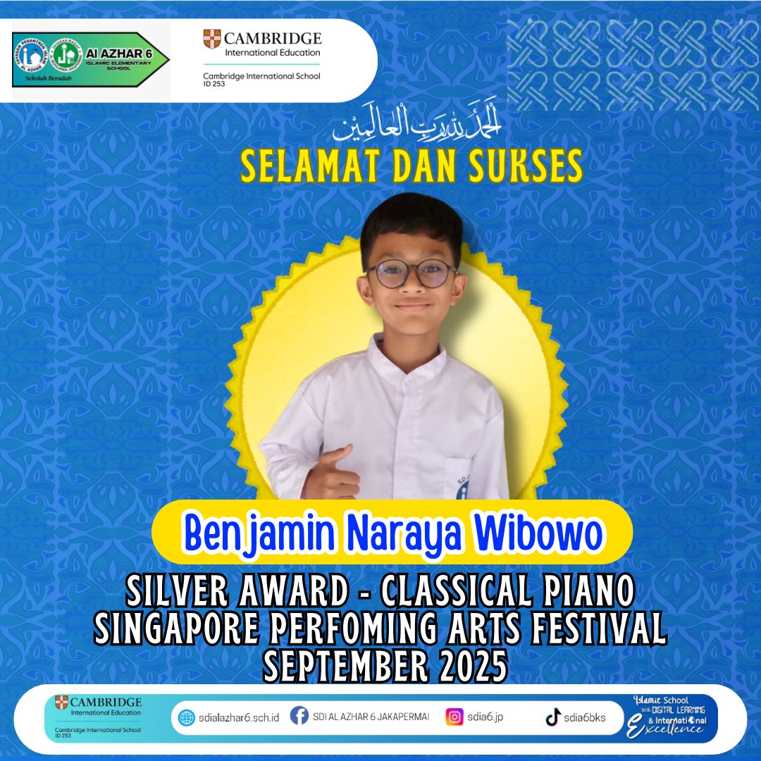 Alhamdulillah. Selamat dan sukses untuk ananda Benjamin Naraya Wibowo yang telah meraih Silver Award pada ajang Singapore Performing Arts Festival kategori Classical Piano.Prestasi ini menjadi bukti nyata dari kerja keras, ketekunan, dan bakat yang luar biasa. Semoga capaian ini menjadi motivasi untuk terus berkarya, menginspirasi, dan meraih prestasi yang lebih gemilang di masa depan. 🌟🎶🎹