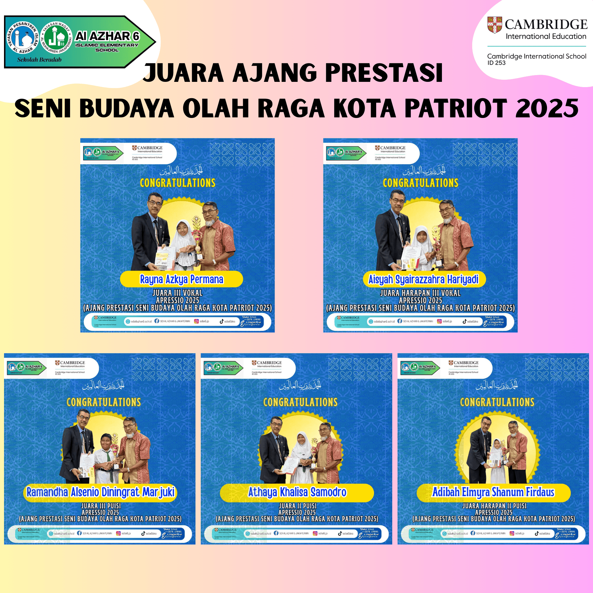 Alhamdulillah murid-murid SDI Al Azhar 6 Jakapermai berhasil meraih prestasi dalam kompetisi Ajang Prestasi Seni Budaya Olah Raga Kota Patriot 2025. Selamat kepada kalian semua atas prestasi yang telah diraih. Semoga tetap terus berprestasi lebih baik lagi. Aamiin, kalian semua hebat, keren, dan terbaik.